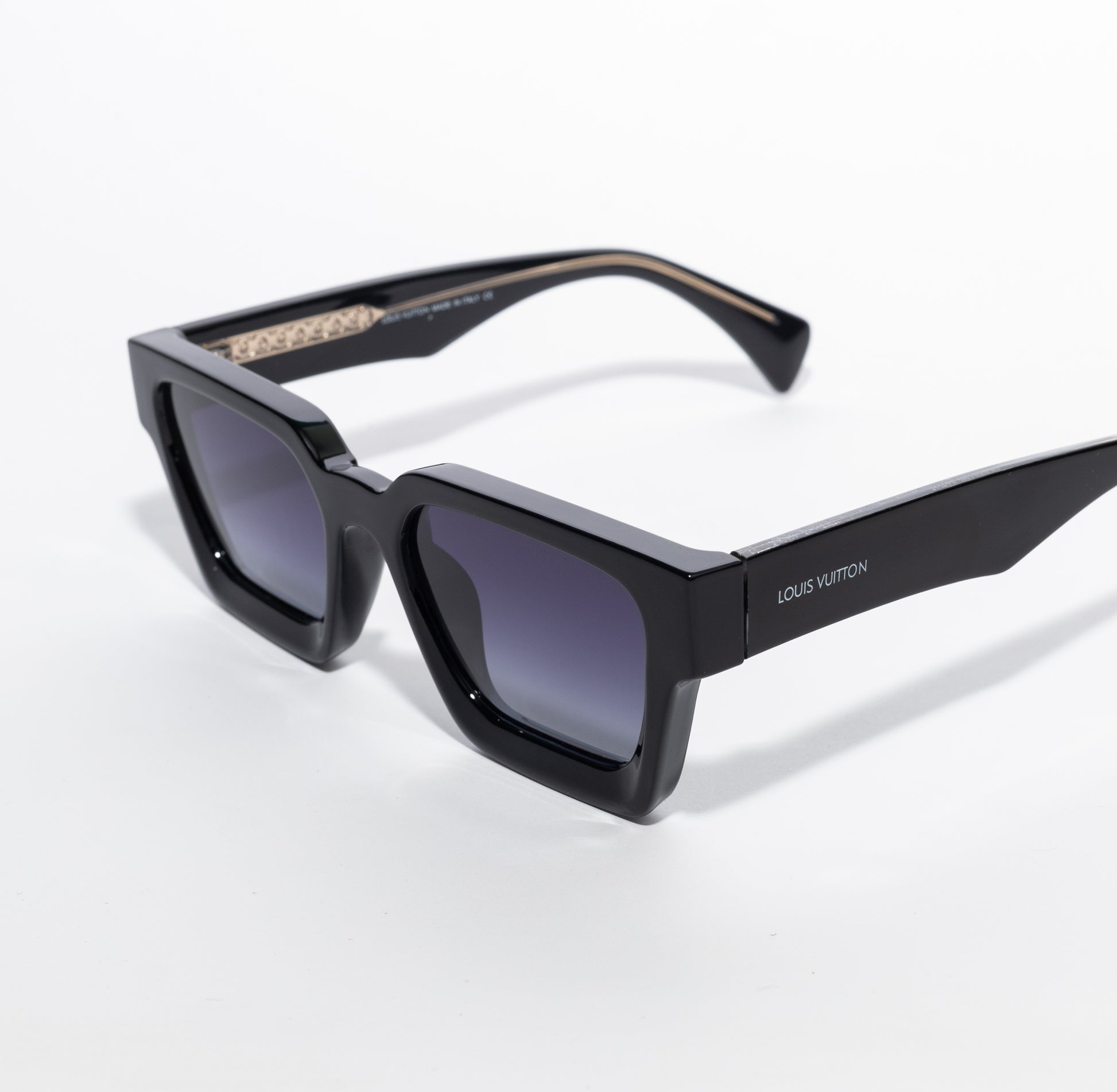 These contemporary sunglasses feature a bold, rectangular frame with a thick, sculpted profile. The wide temples are debossed with the Louis Vuitton signature, while the lenses have a gradient finish. Designed for a modern and stylish look, these sunglasses offer a perfect balance of statement-making design and timeless elegance. The robust construction and distinctive silhouette make them a versatile accessory for any wardrobe.