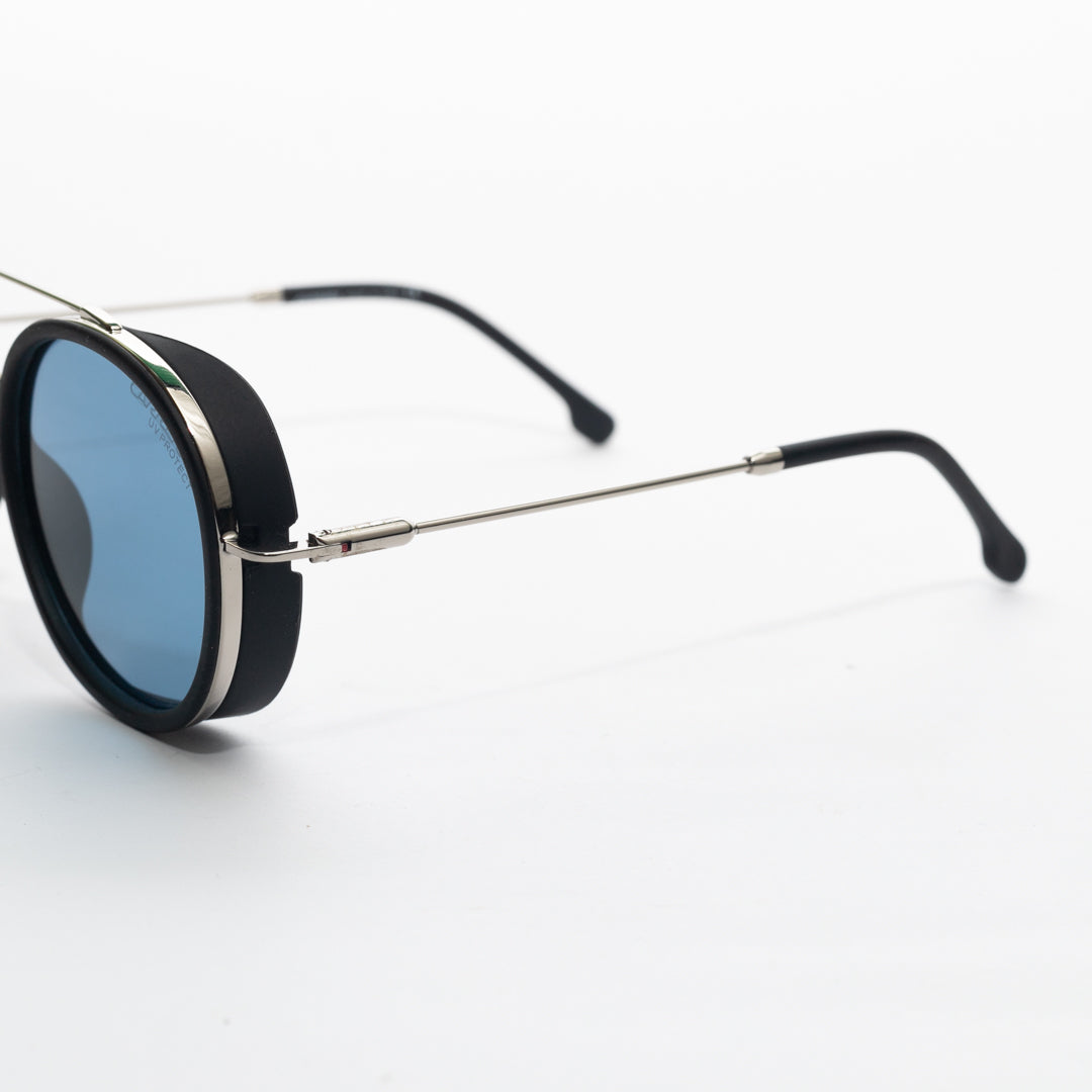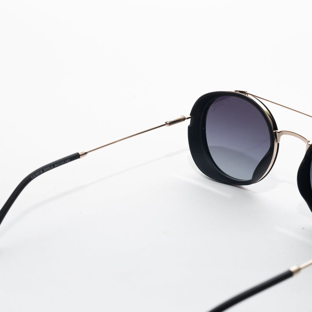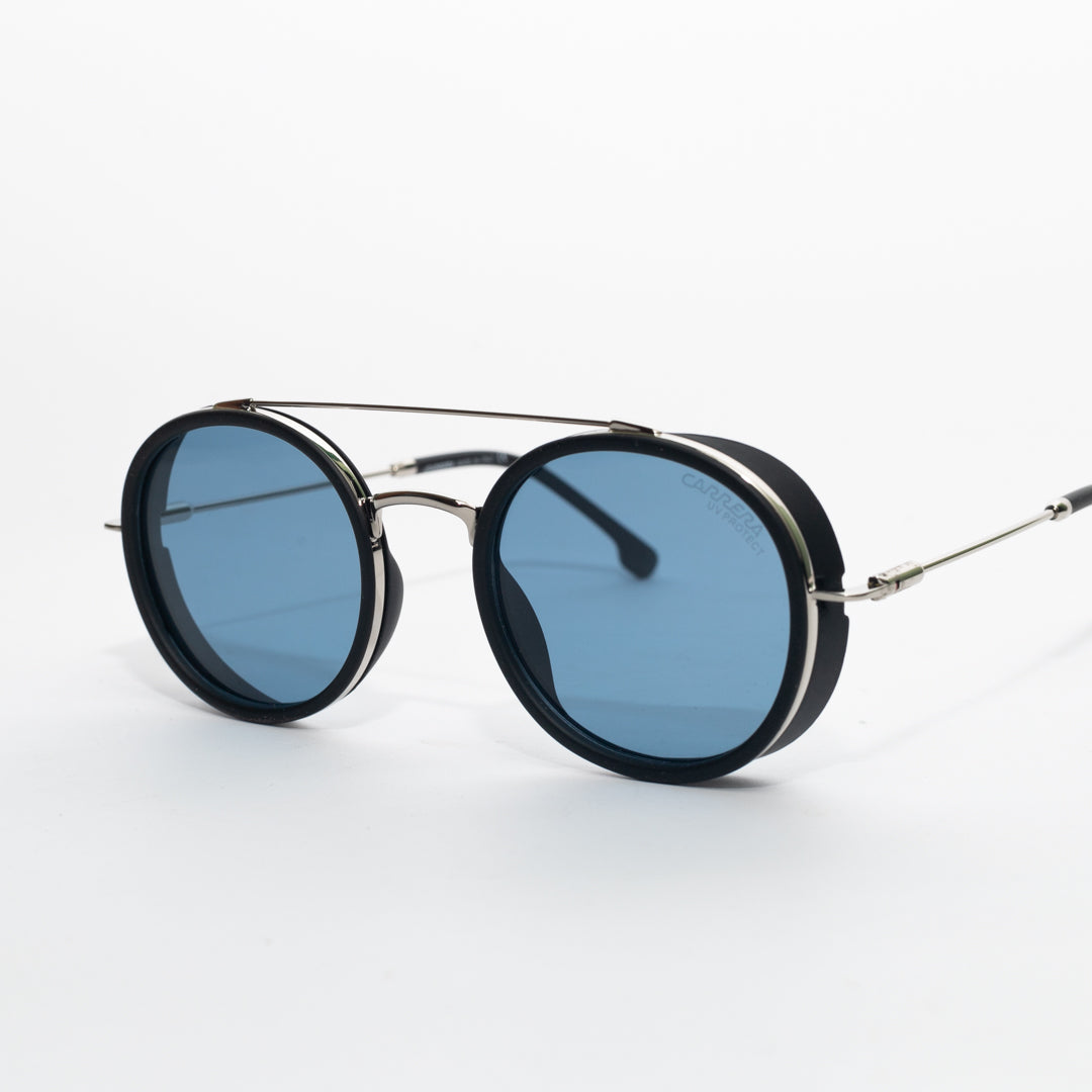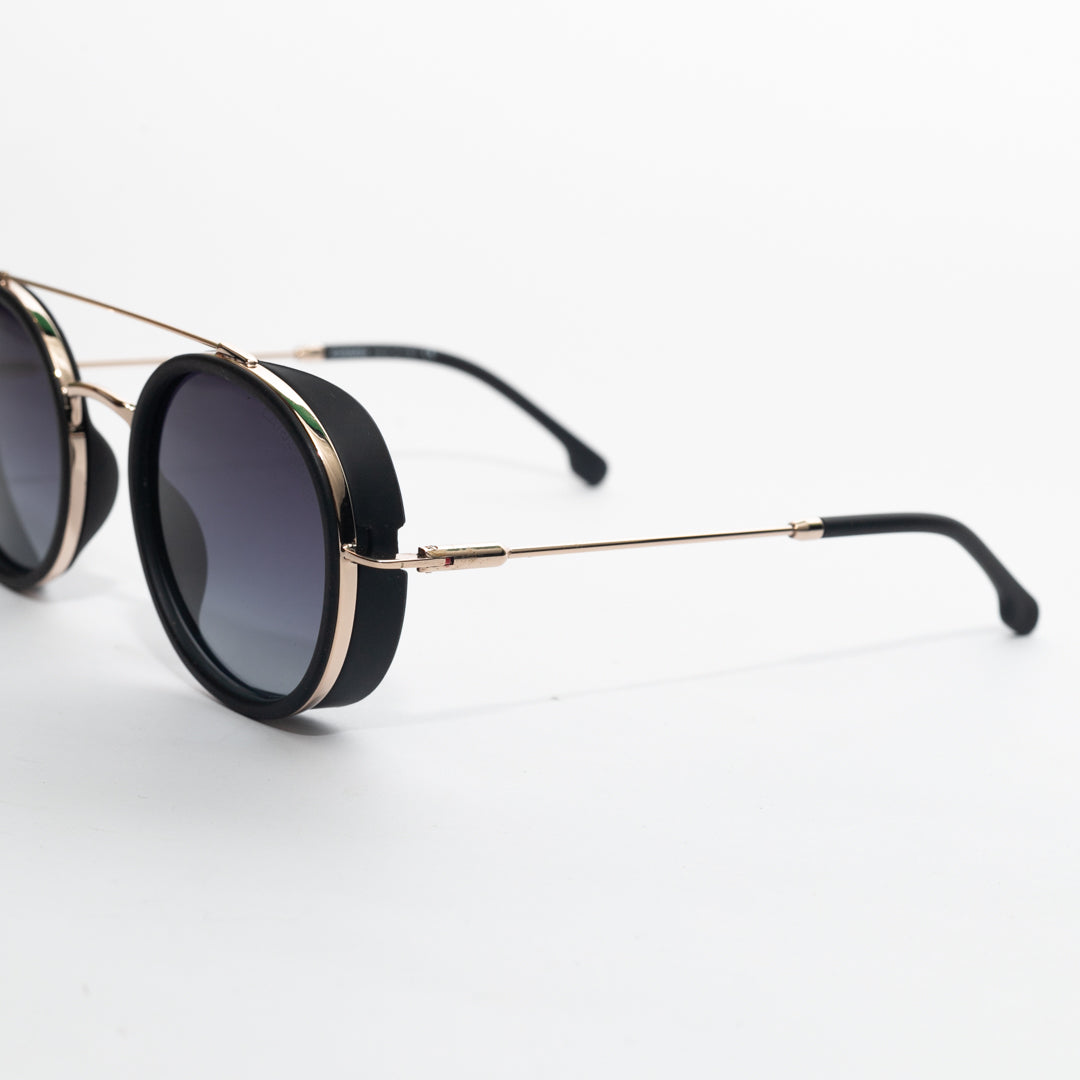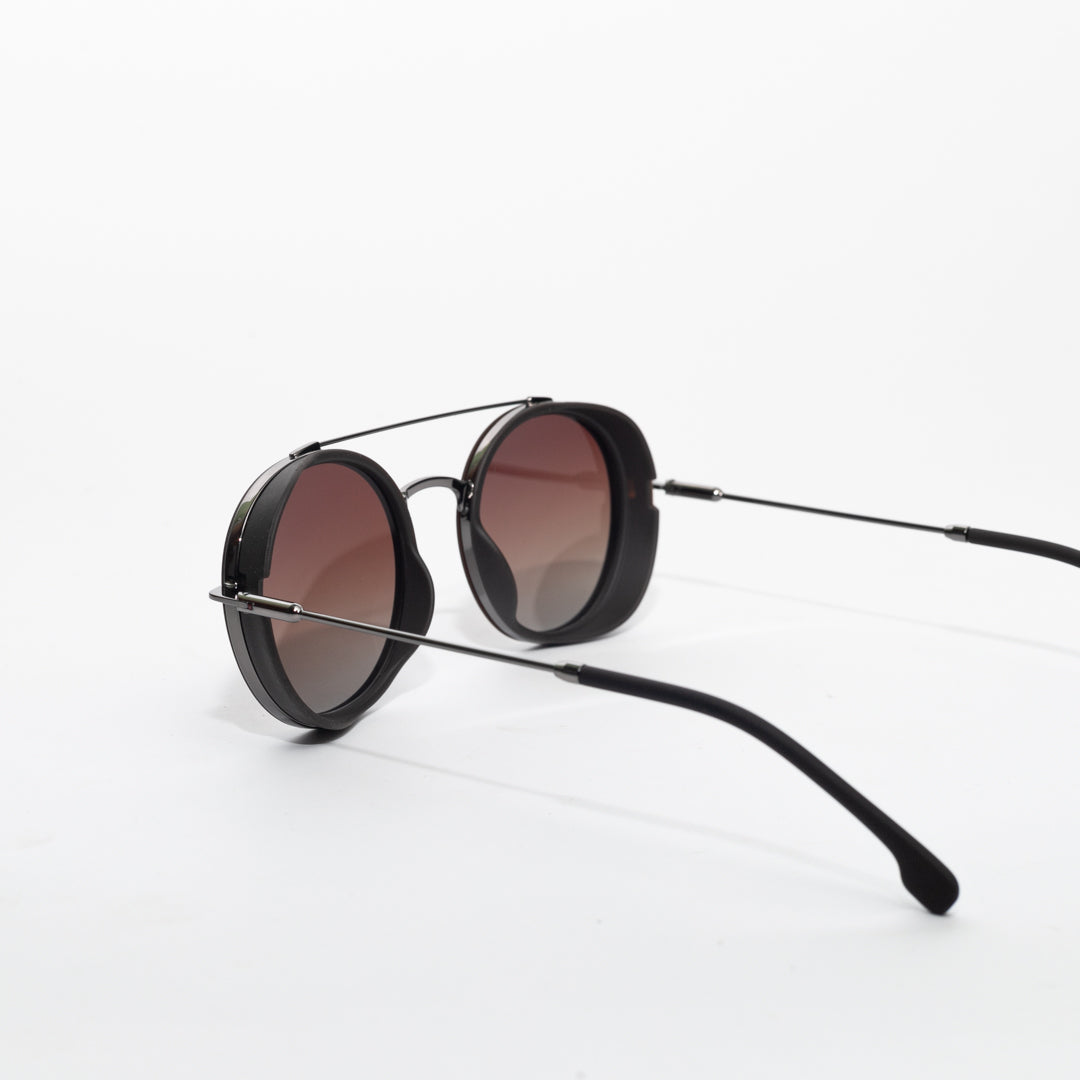 These striking round sunglasses offer a bold and distinctive look. Featuring a sleek metal frame and unique side shields, they combine contemporary style with an industrial edge. The double bridge design adds a touch of sophistication, while the slender temples ensure a comfortable fit. Perfect for those seeking a standout accessory that blends vintage inspiration with modern flair.