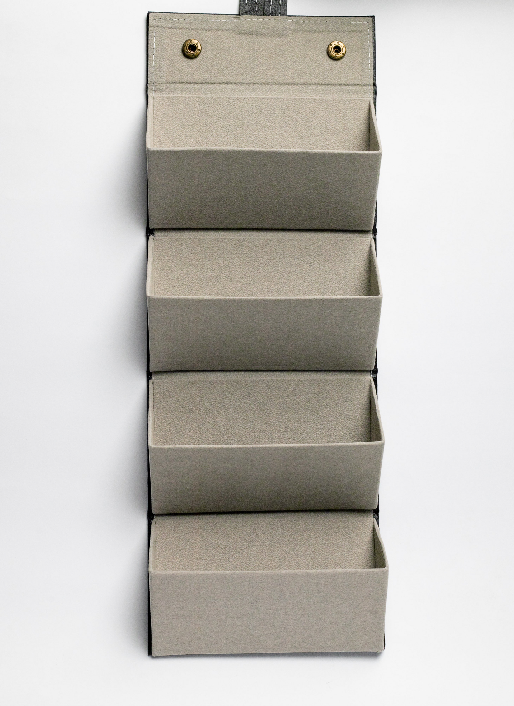A practical home-use organizer with 4 compartments to neatly store and protect your eyeglasses or sunglasses. Keeps all your eyewear in one place, making it easy to choose the right pair every day. Foldable design with secure button closure for space-saving and safe storage.
