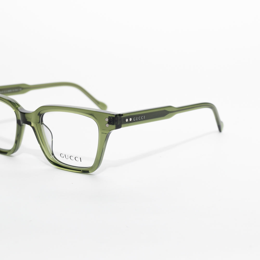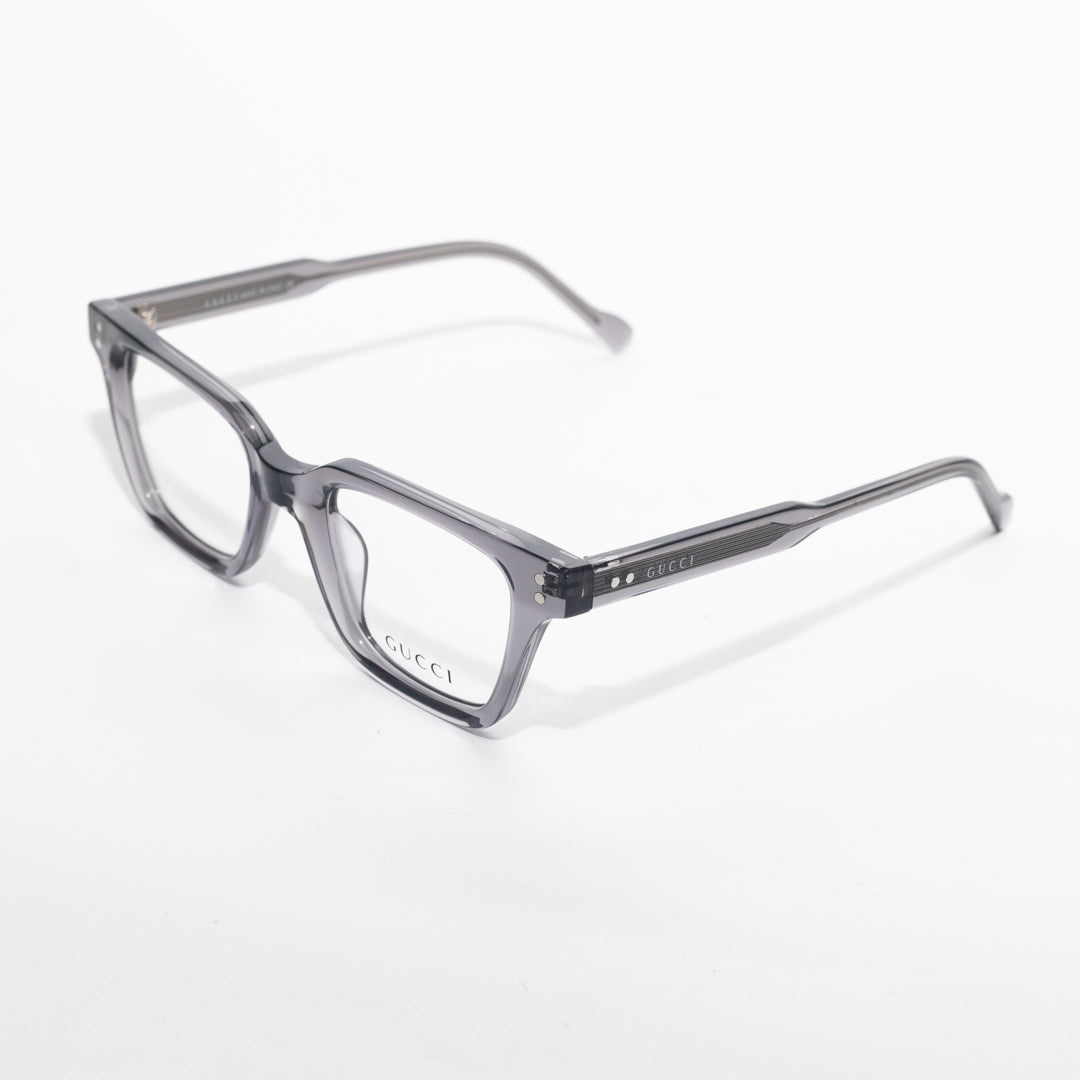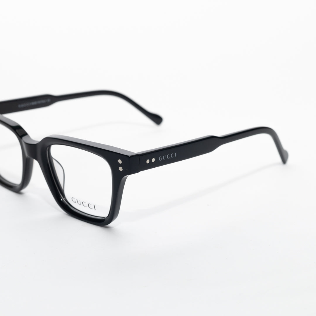 Iconic eyeglasses by Gucci featuring a bold square acetate frame with signature metallic rivets and subtle logo detailing on the temples. A statement piece that combines fashion-forward design with everyday wearability.